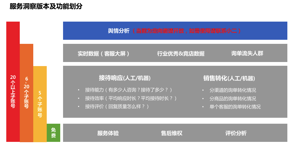 过往大家可能觉得服务洞察只是一款客服绩效管理工具,实际上经历最近一段时间的升级,服务洞察还能帮助大家解决绩效管理以外很多的问题,例如全店实时的体验诊断及询单转化分析,更有流失人群一键分析再营销,品牌及全店的舆情分析报告也正在灰度测试,定向开放中!2020年,赢在服务!