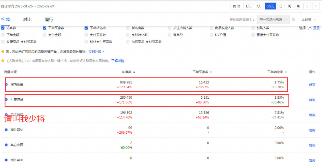 看下我做的这个店铺,付费流量和淘内免费流量基础相同,这就属于正常的转化结构。