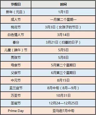 像是国外的一些重大节日情人节:视频、珠宝、手表、箱包商品;母亲节:时尚饰品、珠宝、手表、箱包、贺卡、消费电子商品;劳动节:服装、美容美化产品;万圣节:体育用品、毛绒玩具、南瓜灯等商品;复活节:服装、美容美妆产品、户外用品;圣诞节:取暖设备、化学设备等商品。